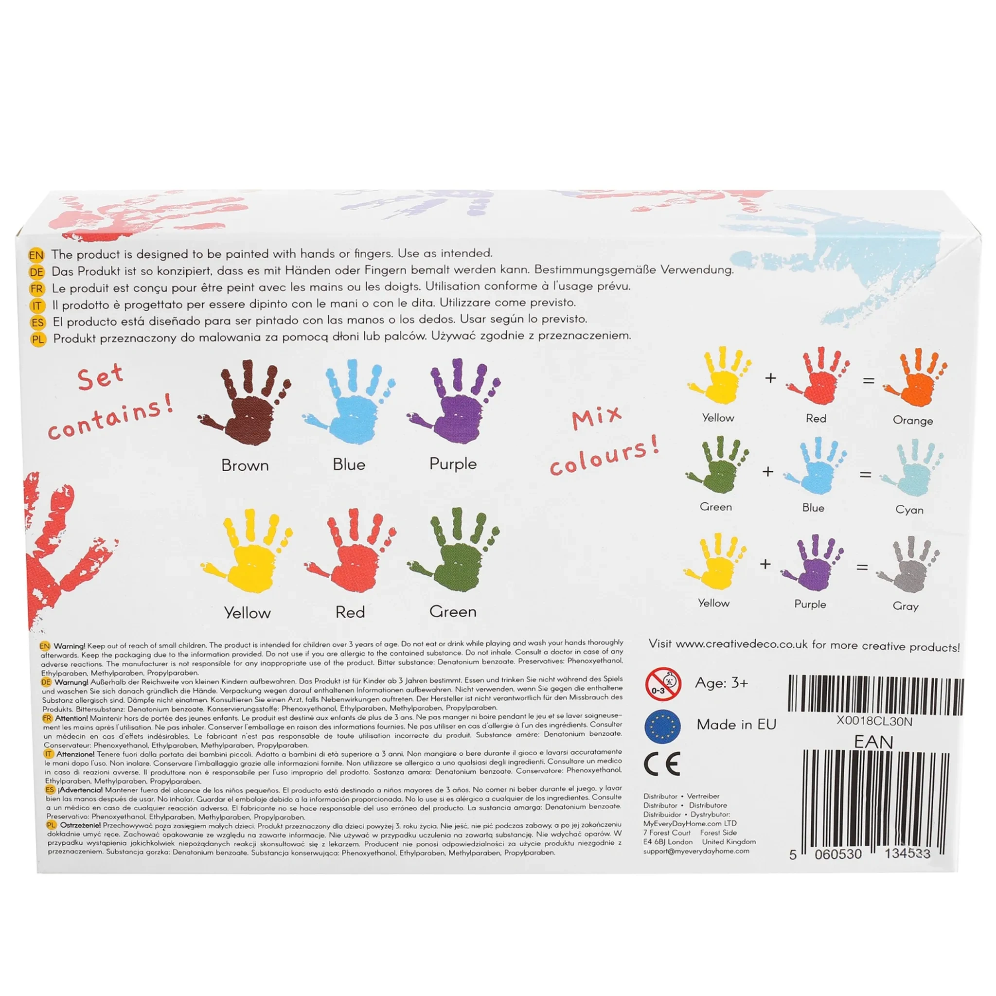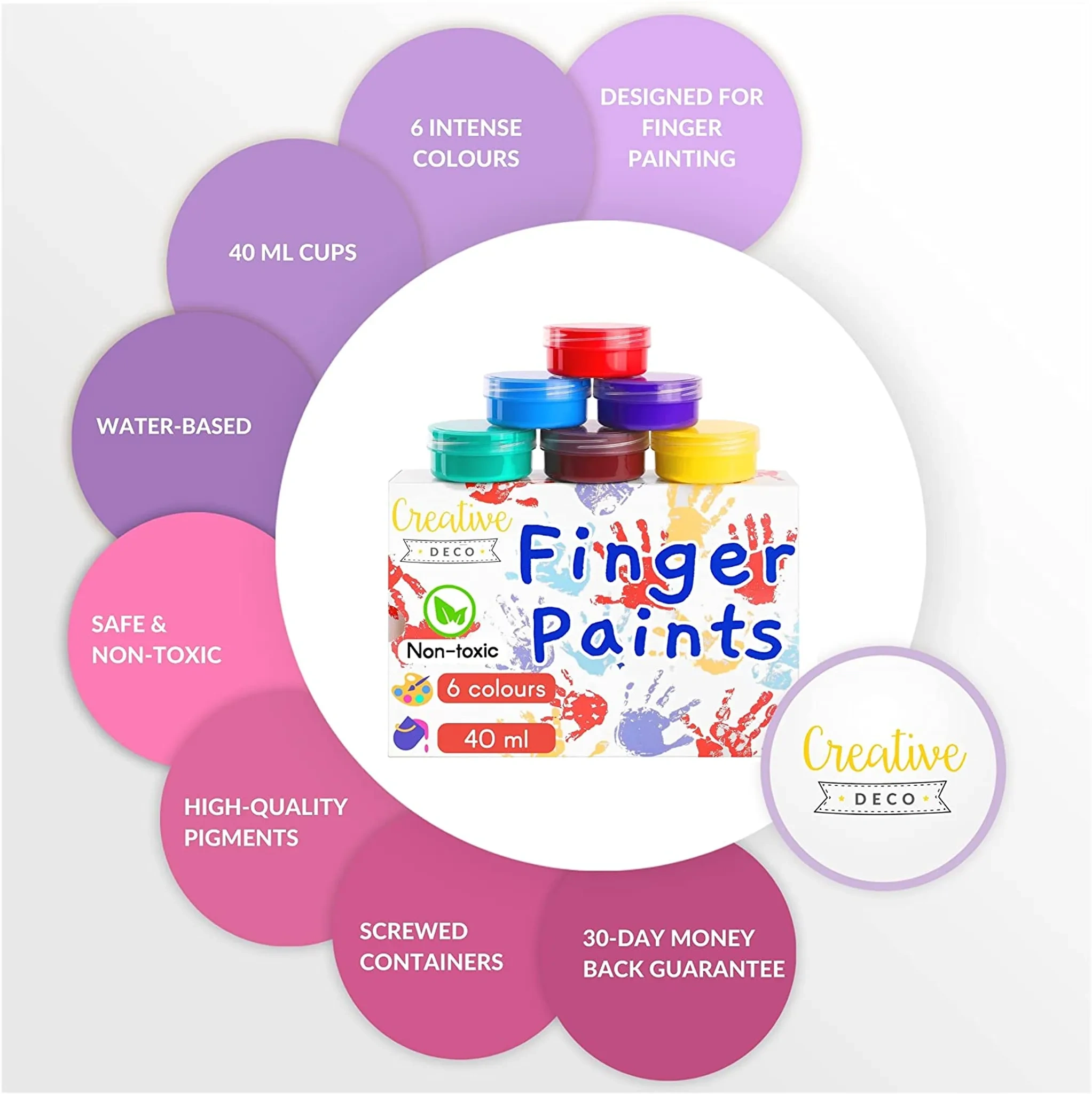 Das Creative Deco Fingerfarben-Set enthält 6 leuchtende Farben in praktischen Schraubbechern (je 40 ml) und ist ideal für kreative Kinderhände. Die Farben lassen sich untereinander mischen, sodass neue Töne und Schattierungen entstehen können. Geeignet für Papier, Karton, Holz oder Leinwand – grenzenloser Malspaß für die Kleinsten.